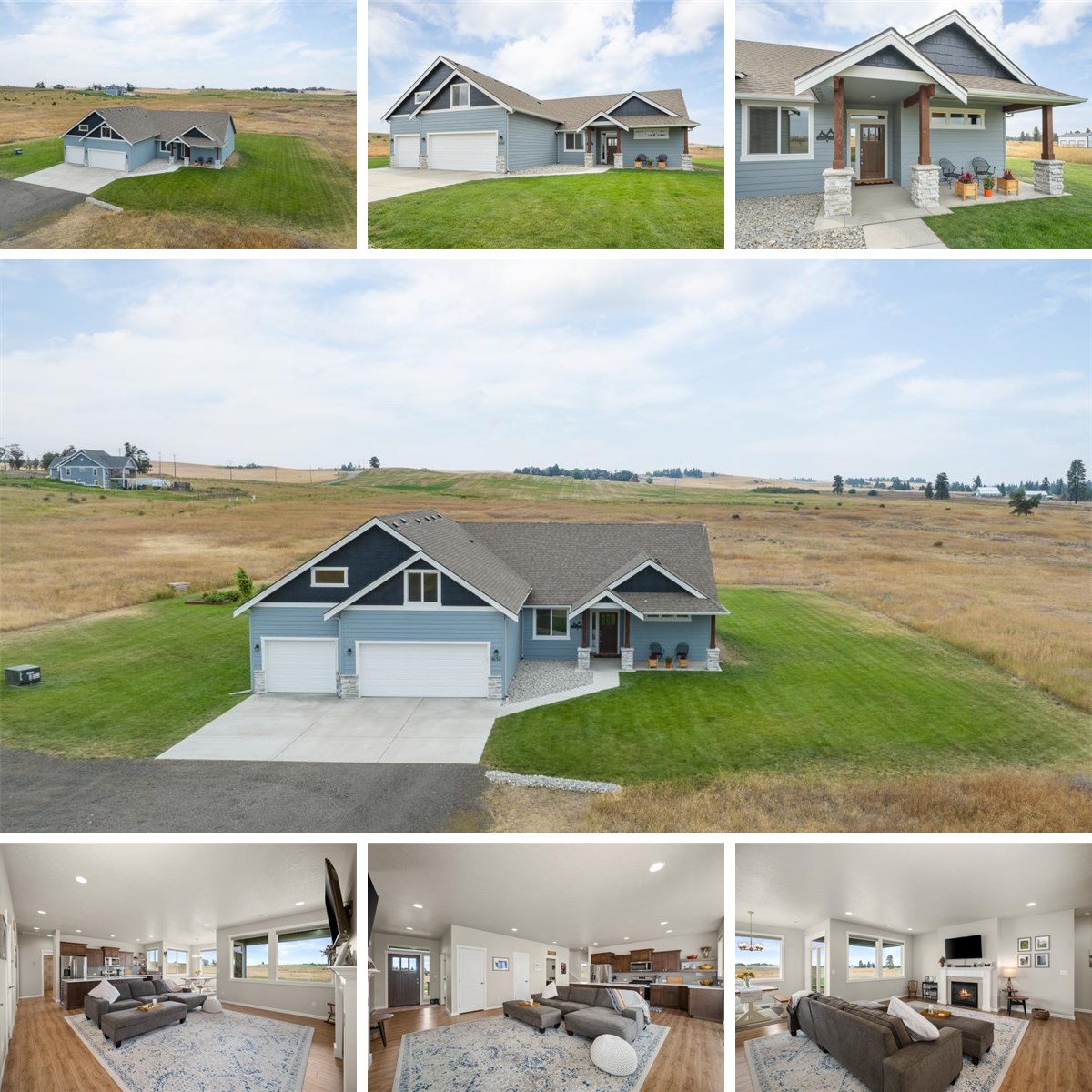 This stunning Gordon Finch home sits on 10 acres inside Rolling Hills Estates! This small community of homes is only 20 mins from Spokane, 8 from Cheney and it has a wonderful country feel with all the amenities you're looking for! The great room provides a serene view and you'll love the ease of the gas fireplace and LVP flooring. The kitchen includes a gas stove, spacious island and modern open shelving. The primary suite is on one side of the home and includes a large tiled shower, linen closet, separate toilet room and walk-in closet. The other side of the home includes 2 beds and a bath with a door separating the shower with toilet from the double sinks! The office (or 4th bed) includes glass french doors and a closet. The huge bonus room sits above the 3 car garage, and the laundry room includes a built-in drop zone too. The flat, grassy property has a huge parking area and plenty of room for a shop, pool, sports court and even horses!
