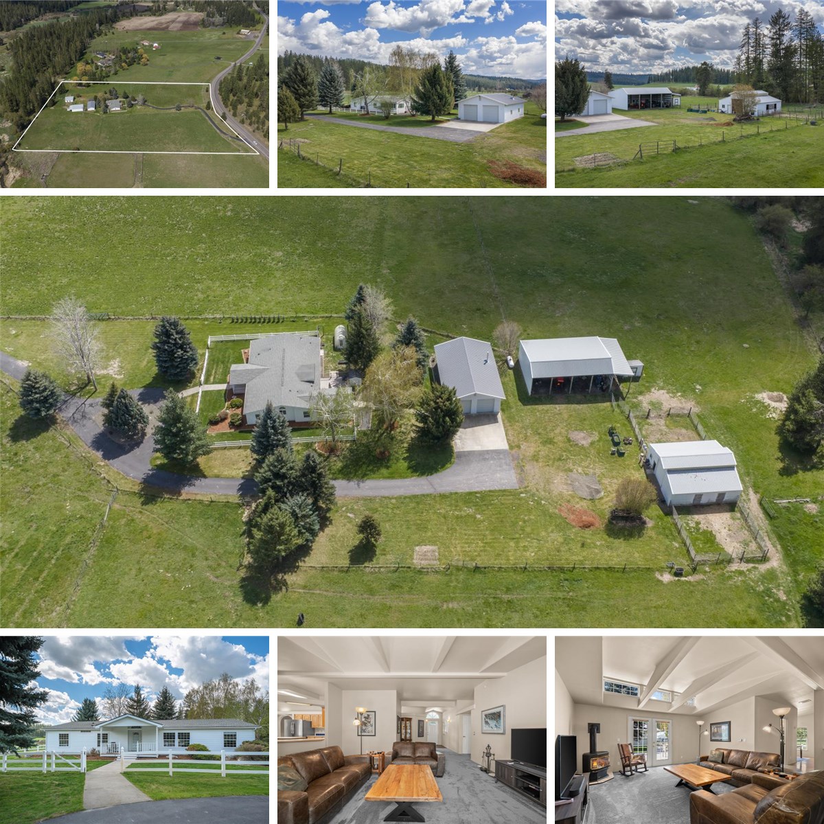 Welcome home to this 9.92-acre equestrian and livestock retreat at the base of Mt. Spokane, offering privacy, open space, and breathtaking territorial and mountain views. This 3 bed, 3 bath home features over 3,000 sq ft of main floor living, including a spacious kitchen, formal dining, great room, office, and light-filled sunroom surrounded by windows to take in the natural beauty. The expansive primary suite includes a lounge area, walk-in closet, garden tub, and double vanity. Enjoy peaceful mornings and evenings from both front and back porches. Perfect for horse owners and outdoor enthusiasts, the property is fenced and cross-fenced with a 4-stall barn, tack room, hay storage, heated 30’x50’ shop with office, and 30’x60’ pole building. Greenhouse, garden beds, irrigation, and a tranquil pond complete the setting. Just minutes from Mt. Spokane trails, this is the ideal base camp for hiking, riding, and year-round outdoor adventure.