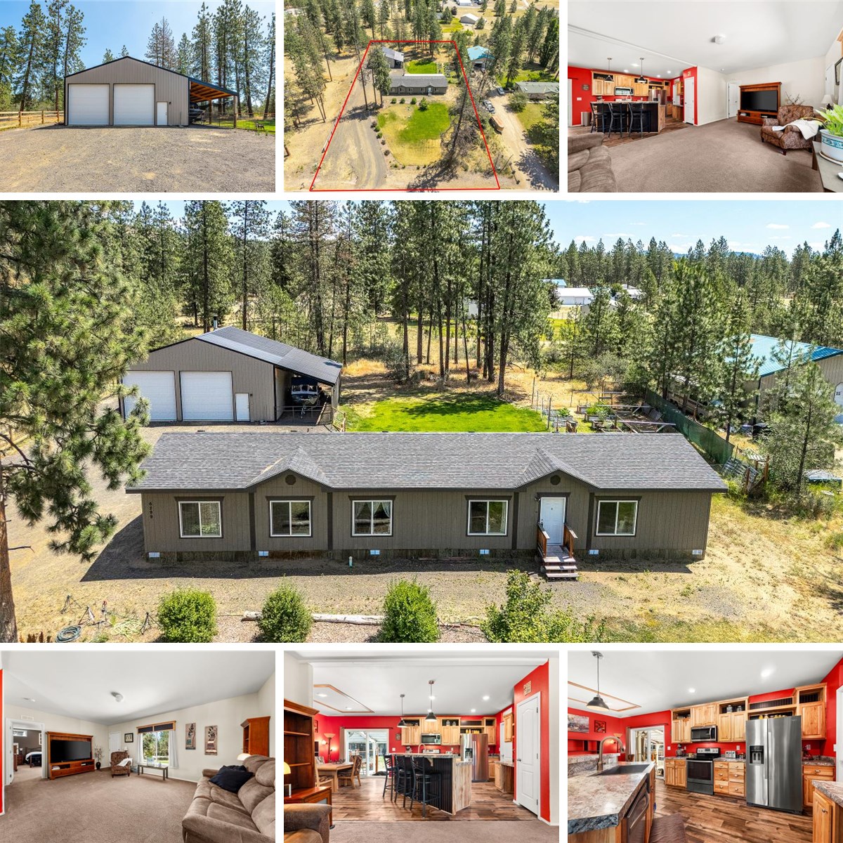 Enjoy Country Living in Beautiful Nine Mile Falls. Built in 2017 this 4-bedroom, 3-bath home offers 1,800 sq. ft. of comfortable living space with two family rooms and an impressive 36' x 36' shop on .90 of an acre. The open-concept layout includes a warm, inviting kitchen with knotty alder cabinetry, stainless steel appliances, farmhouse sink, pantry, and eating bar, perfect for everyday living. The primary suite features a walk-in closet and spa-like bath with dual vanities, tiled step-in shower, and a relaxing garden tub. Outside, the fully fenced backyard includes a covered patio, greenhouse, and a garden with raised beds perfect for any green thumb. The shop is a standout, with concrete floors, LED lighting, wood-burning stove, 12' x 12' doors, a loft, and two additional lean-tos (14' x 36' and 12' x 24') offering ample space for tools, toys, or recreational equipment. The property is generator-ready for added peace of mind. Just minutes to Long Lake Boat Launch, ORV Park, schools, shopping, and more!
