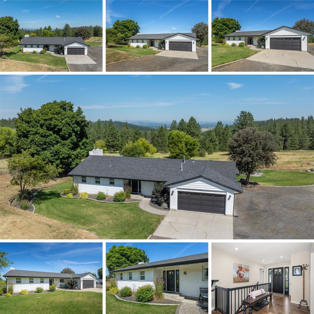 Country living on 2.79 acres only 5 minutes from town! Bring your horses, chickens or other farm animals and your green thumb with plenty of room to garden or hobby farm! Stunning views from living room, dining room and kitchen. Over-sized deck perfect for entertaining. Large open concept main floor with updated kitchen, Quartz counter-tops and stainless appliances. Main-floor primary suite and additional bedroom and half bath on the main floor. Daylight walk out basement features two more bedrooms, large family room and fireplace. Insulated shop with 220V power and other outbuildings. Conveniently located between Spokane Valley and North Spokane. New in 2020: Windows, roof, electrical panel, Furnace, A/C, outbuilding roofs, septic tank and drain field, garage doors, flooring, interior and exterior paint, kitchen counter-tops, kitchen cabinets, appliances, bathroom vanities, showers, and so much more. This is the close-in home on acreage you have been waiting for!